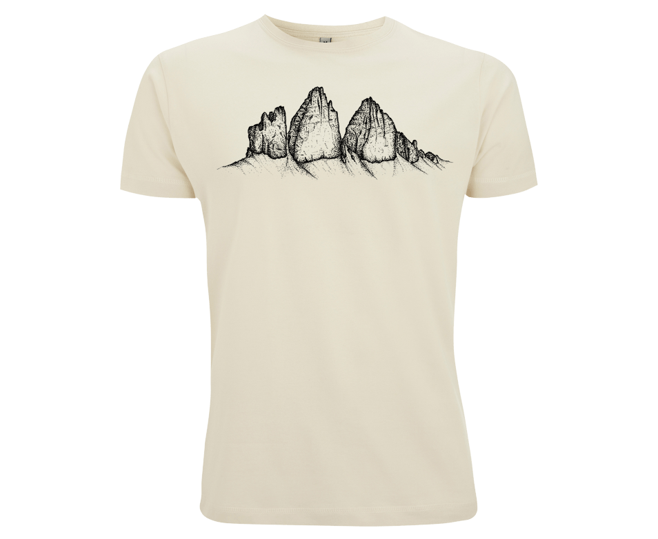 In Zusammenarbeit mit Erika »Ulligunde« Dürr entstand dieses minimalistische – Die drei Zinnen auf dunkelgrauem Herren-Shirt. Die Zeichnung stammt aus einer Reihe von alpinen Zeichnungen, die neben den Süd-Tiroler »Drei Zinnen« auch Berge wie Matterhorn, Cerro Torre, Watzmann, Hochvogel und Elbrus abbilden. Alle Werke sind auch auf ihrer Website zu finden: ulligunde.com/kreatives