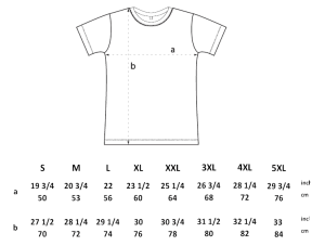 Schnapp´ dir dein Lieblingsshirt (bezogen auf die perfekte Größe) und vergleiche es mit den Maßen aus der folgenden Skizze/ Tabelle.